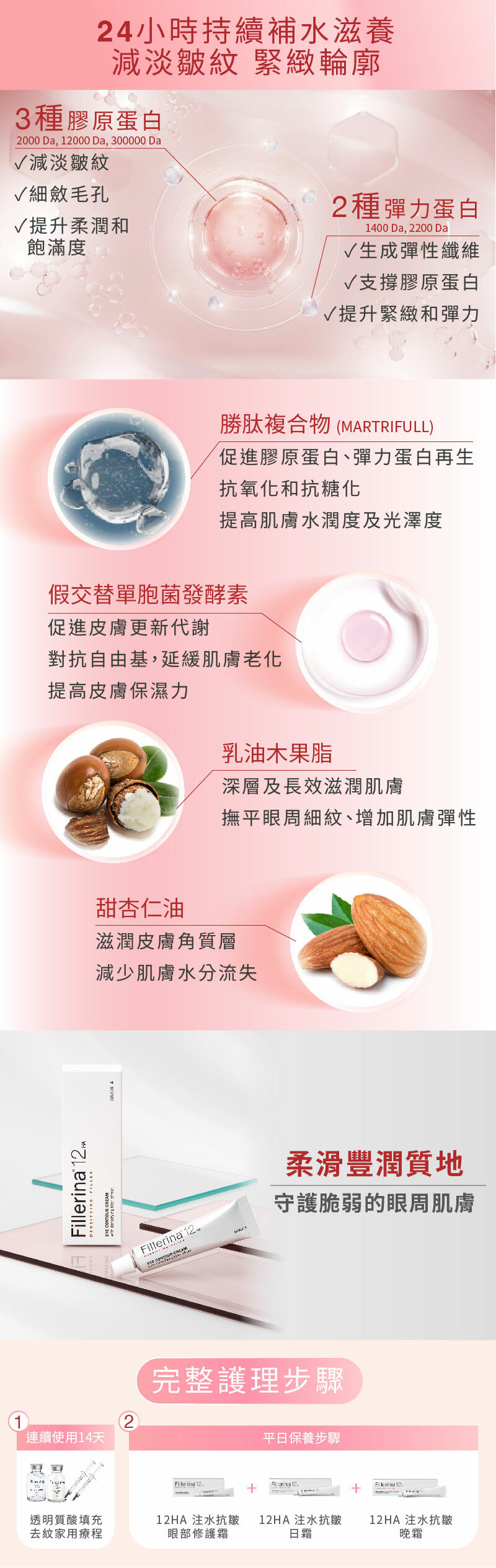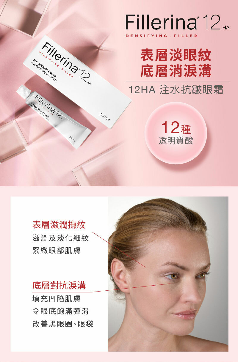 Fillerina 12HA 注水抗皺眼部修護霜 是一款夜間使用的日常護理產品,為肌膚提供補水和緊緻效果,可單獨使用或與其他Fillerina 產品配合使用。