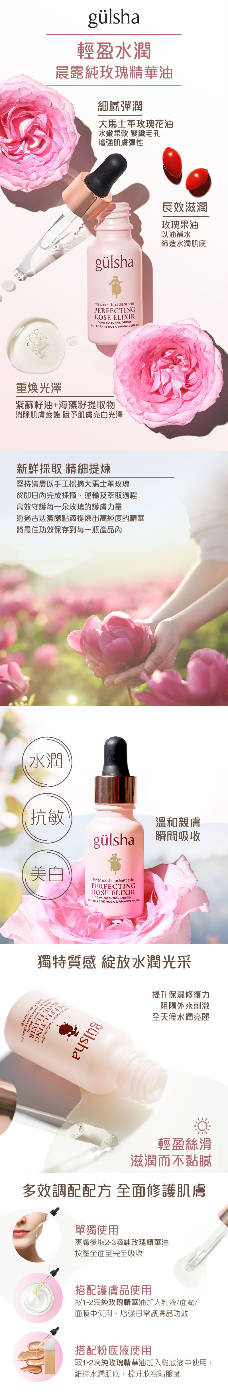 含有強效脂質,能促進肌膚彈性,強化肌膚屏障。gülsha 晨露純玫瑰精華油含豐富的純天然油脂,但不油膩,能迅速滲透,不會阻塞毛孔。