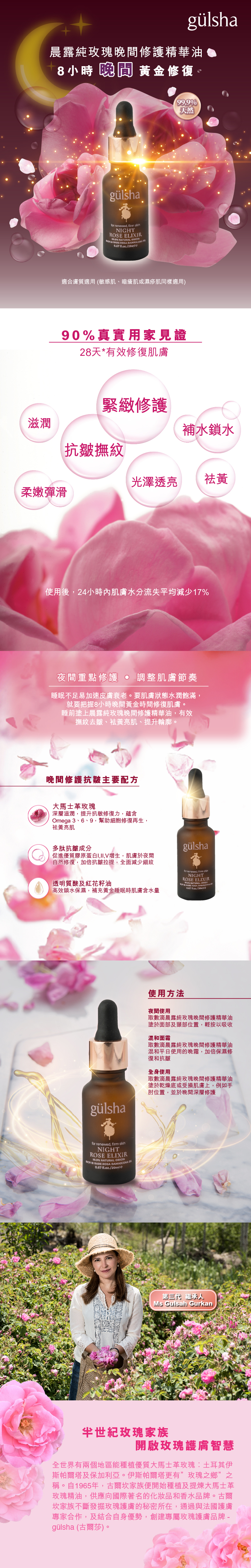 • 含有玫瑰精油和透明質酸混合,可防止皺紋和皮膚隨著時間的推移而鬆弛。