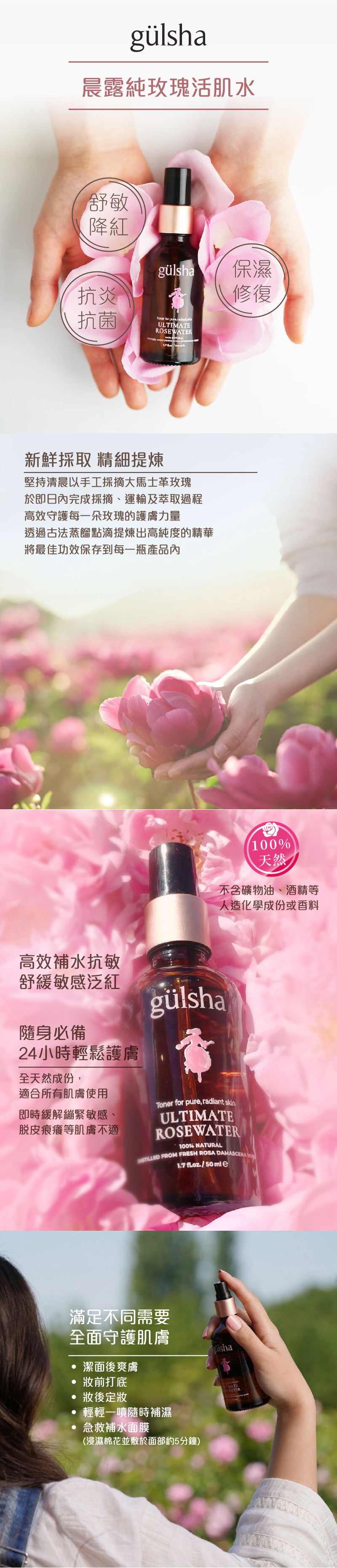 gülsha 晨露純玫瑰活肌水是在純銅醞釀槽中,以溫和的蒸氣蒸餾方式一滴一滴製成,品質極佳。通常,玫瑰水是玫瑰精油蒸餾的副產品。透過保留珍貴的玫瑰精油,gülsha 創造出終極玫瑰水臉部噴霧,其中含有珍貴的大馬士革玫瑰花的所有維生素、礦物質和必需脂肪酸。