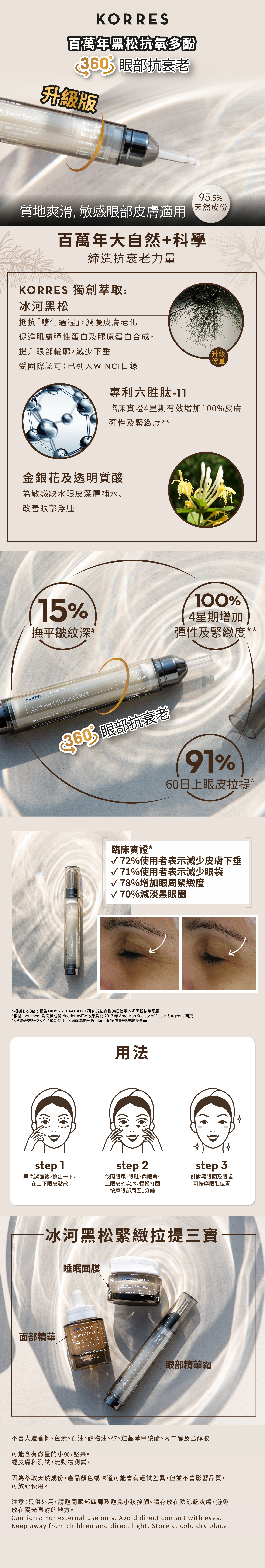 •冰河黑松及天然六胜肽-11有效減少「醣化因子」,緊緻和提升眼部輪廓,預防和減少下垂