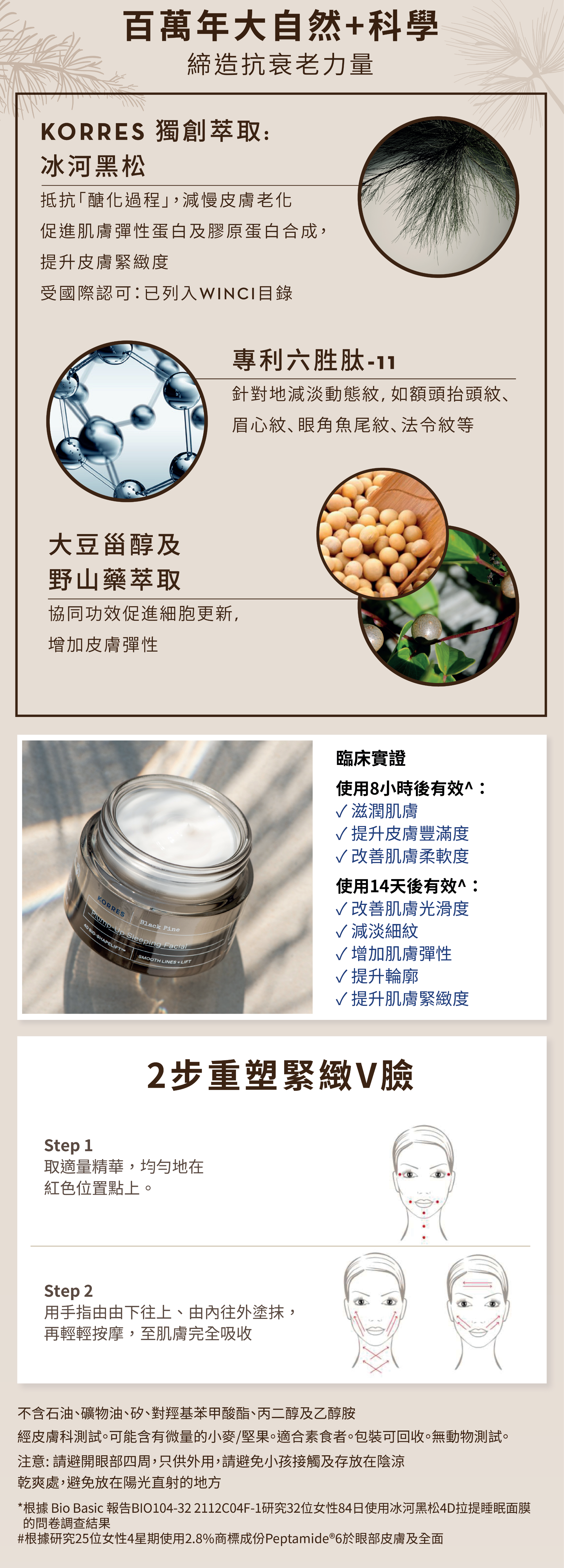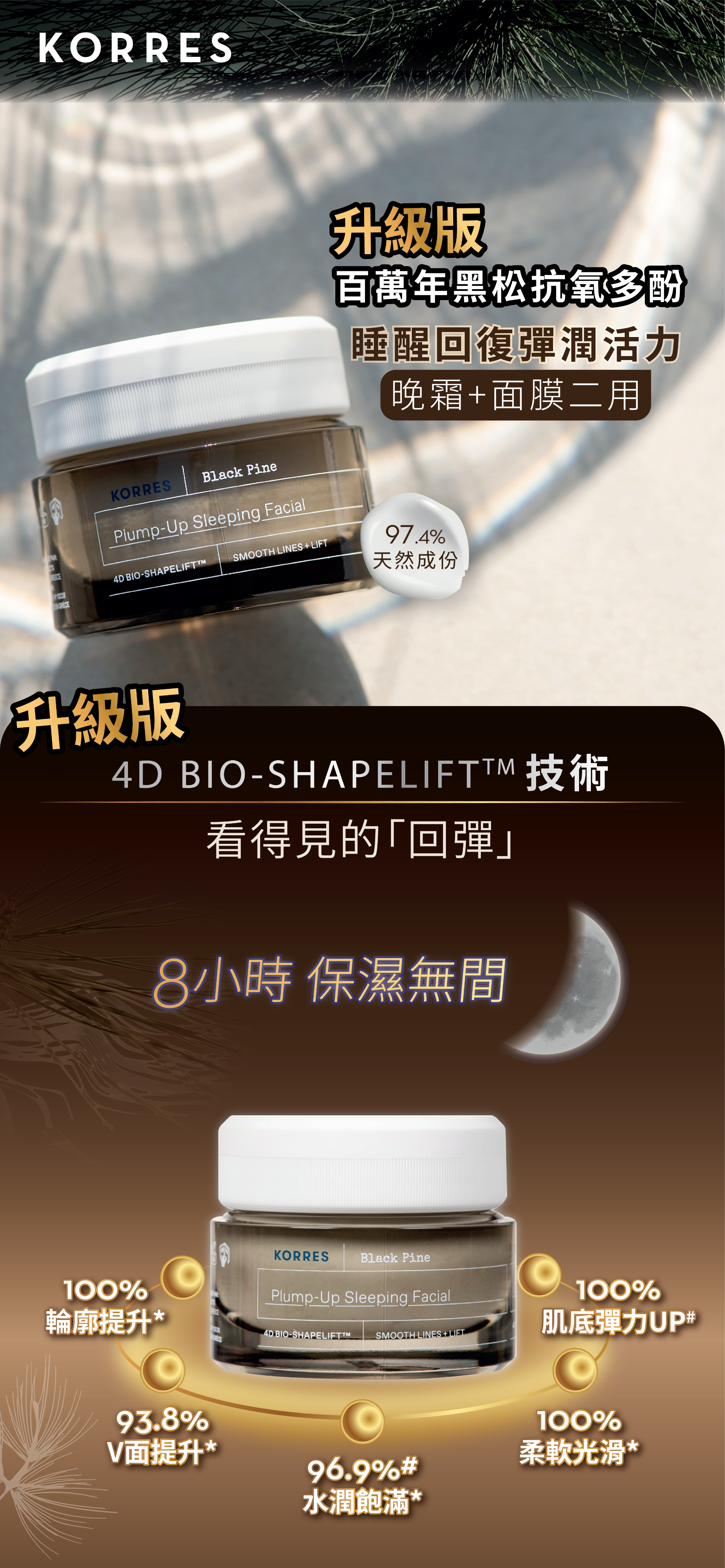 •「升級版」冰河黑松4D拉提睡眠面膜以全新 4D BIO-SHAPELIFT™ 技術,提升肌底彈力,進一步為妳塑造平滑透亮、澎潤彈實、緊緻拉提及對稱塑形之四維完美輪廓。