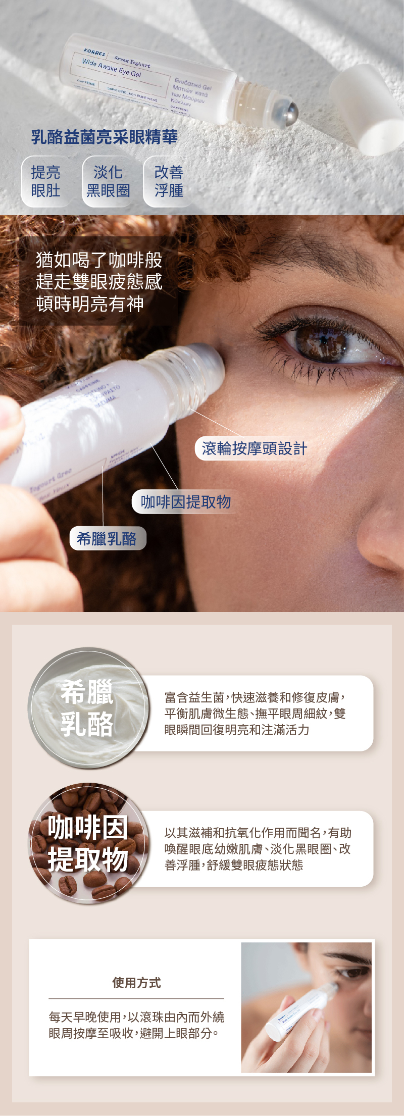 獨特滾輪按摩頭設計,含有滋養的希臘乳酪和咖啡因,,能針對地舒緩疲態的雙眼,即時提亮眼肚肌膚、淡化黑眼圈、改善浮腫和眼周細紋,並滋潤眼底幼嫩肌膚,雙眼瞬間回復明亮和注滿活力 。