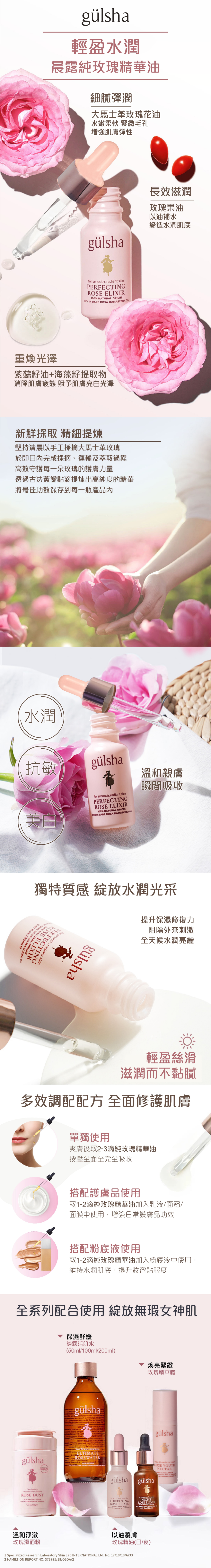 含有強效脂質,能促進肌膚彈性,強化肌膚屏障。gülsha 晨露純玫瑰精華油含豐富的純天然油脂,但不油膩,能迅速滲透,不會阻塞毛孔。
